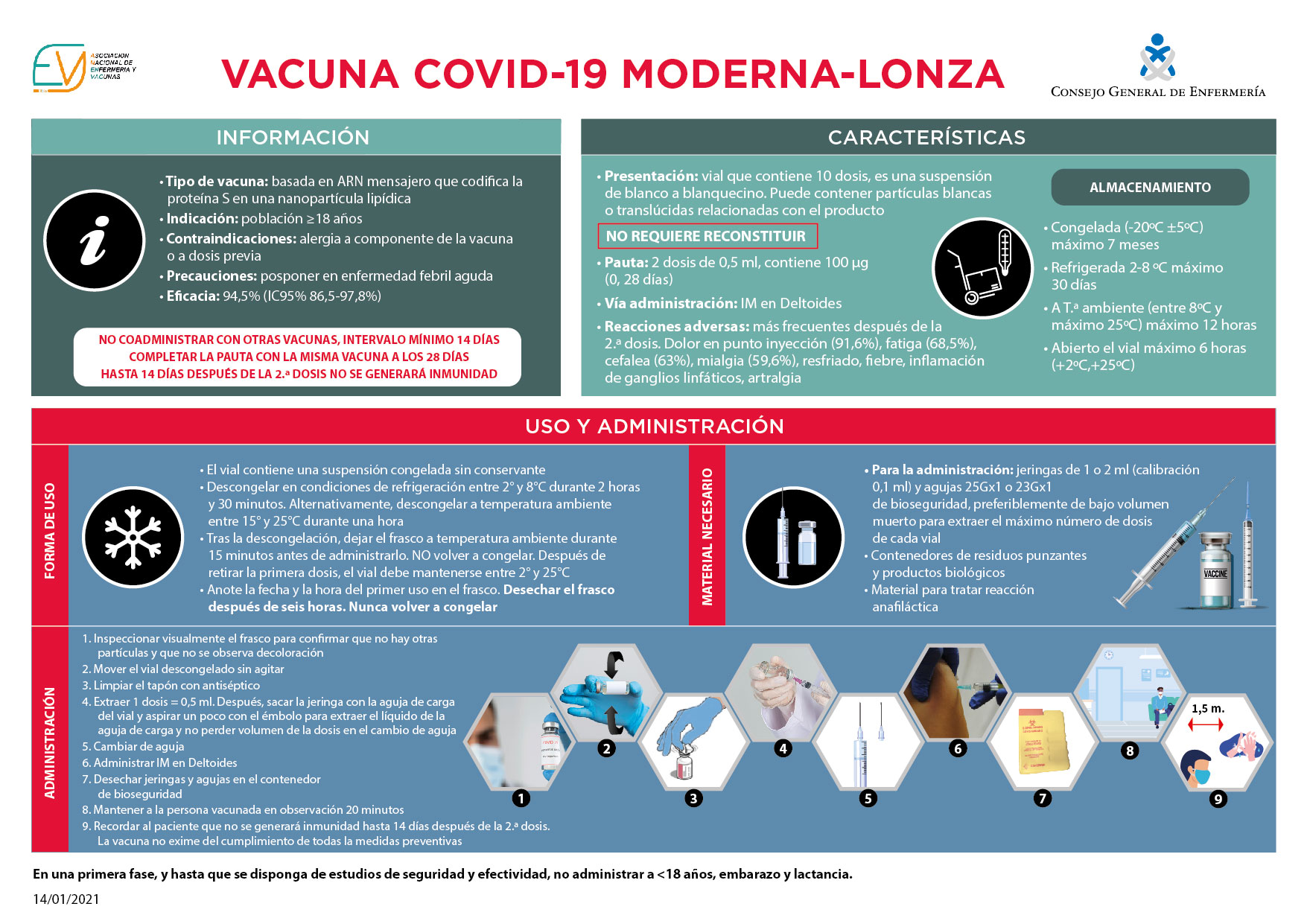 El Consejo General de Enfermería, junto a la Asociación Nacional de Enfermería y Vacunas (ANENVAC), han lanzado una infografía sobre la vacuna de Moderna-Lonza dirigida al personal de enfermería para explicar de forma detallada los puntos clave que deben conocer a la hora de comenzar su administración, con motivo de la llegada a España de las 35.700 dosis.